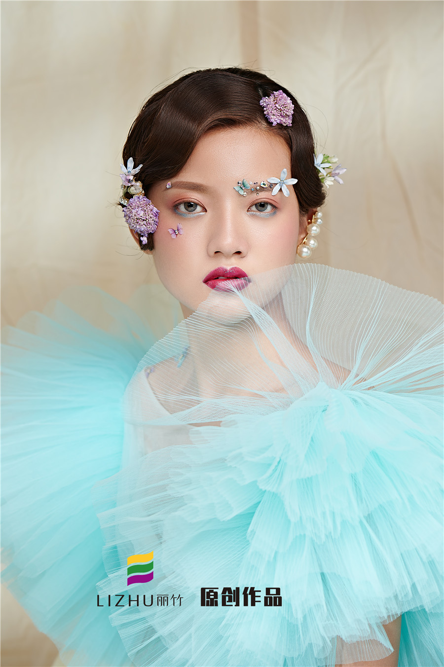 麗竹學(xué)校彩妝作品---氣質(zhì)名媛造型:藍(lán)色輕紗加上妝容花朵點(diǎn)綴,頭飾與發(fā)型的完美搭配,流淌出輕柔舒緩之美,簡(jiǎn)約自然的情緒態(tài)度。