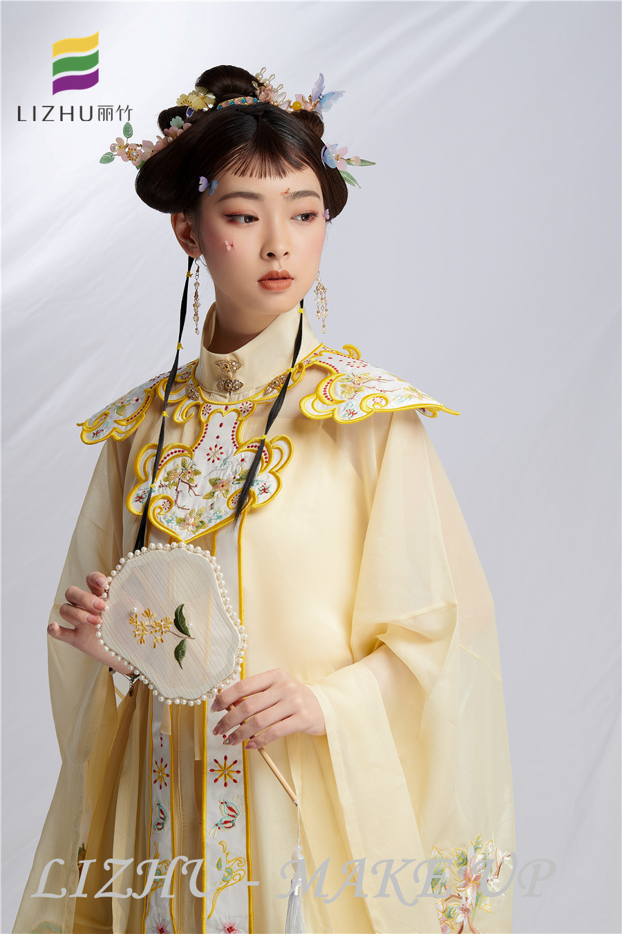淡黃色的服飾與發(fā)飾相互陪襯