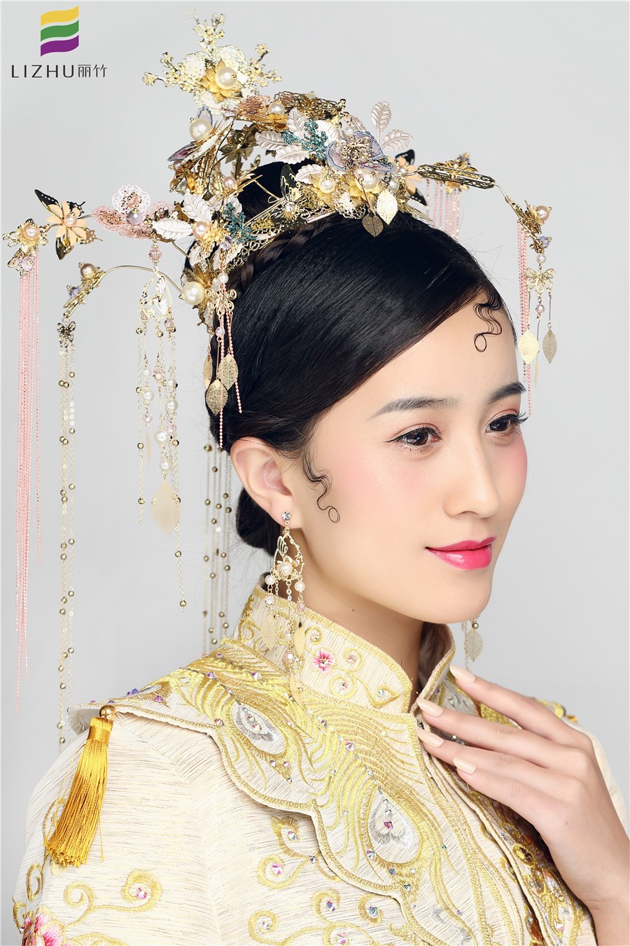 南寧麗竹化妝學校作品---中式復(fù)古造型。婉約典雅,配上搖曳的鎏金頭飾,面上略施粉黛, 一抹朱唇紅艷,幾分婉約賢淑,幾分典雅大氣,精致的中式新娘造型!