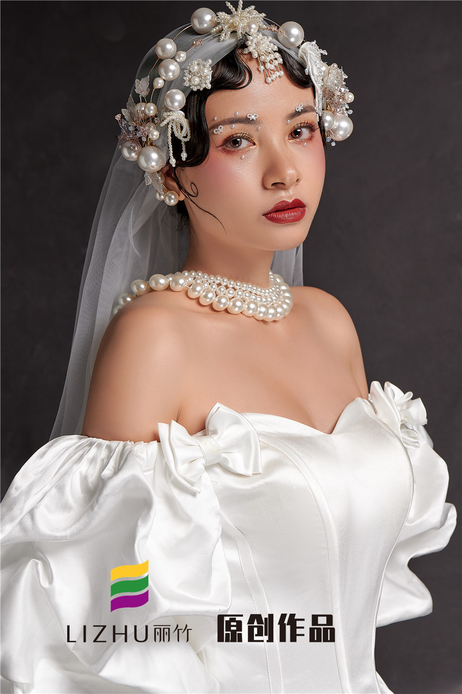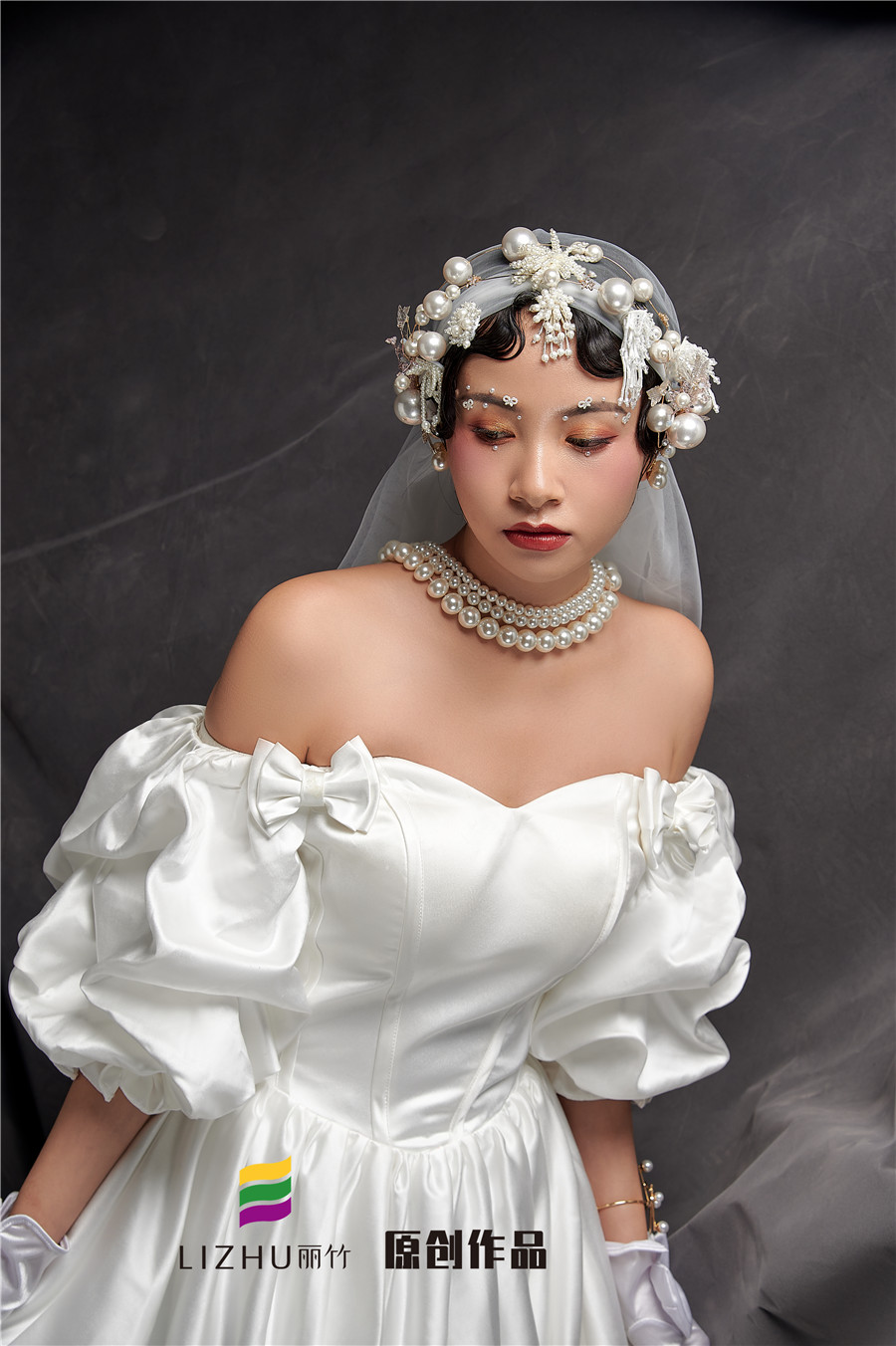 廣西排名前十彩妝學(xué)校分享:麗竹學(xué)校彩妝作品---輕奢復(fù)古造型:潔白充滿(mǎn)設(shè)計(jì)感的禮服,珍珠點(diǎn)綴,星光點(diǎn)點(diǎn)的,是夢(mèng)幻與現(xiàn)實(shí)的交替。