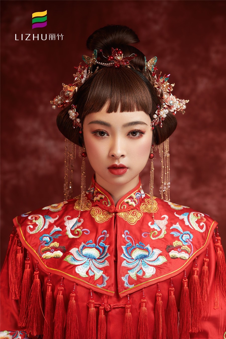 麗竹學(xué)校彩妝作品---中式秀禾新娘造型:蝶舞蹁躚,吉祥如意。極具東方魅力的色彩,妝造出獨(dú)特的國(guó)風(fēng)。一襲中國(guó)紅,端莊典雅,是千年沉淀下來(lái)的古韻悠長(zhǎng)。