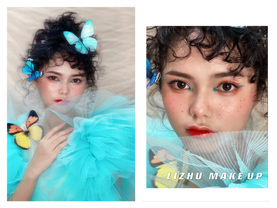 南寧彩妝學(xué)校作品分享---個(gè)性寫(xiě)真制造型:蝴蝶頭飾與羊毛卷發(fā)型的組合,搭配今年大火的雀斑曬傷腮紅妝容,將嬌羞與純美展現(xiàn)無(wú)遺,甜美如晨間綻放的花蕾。