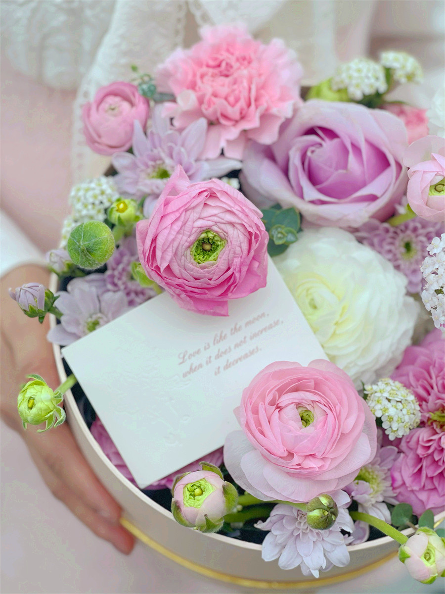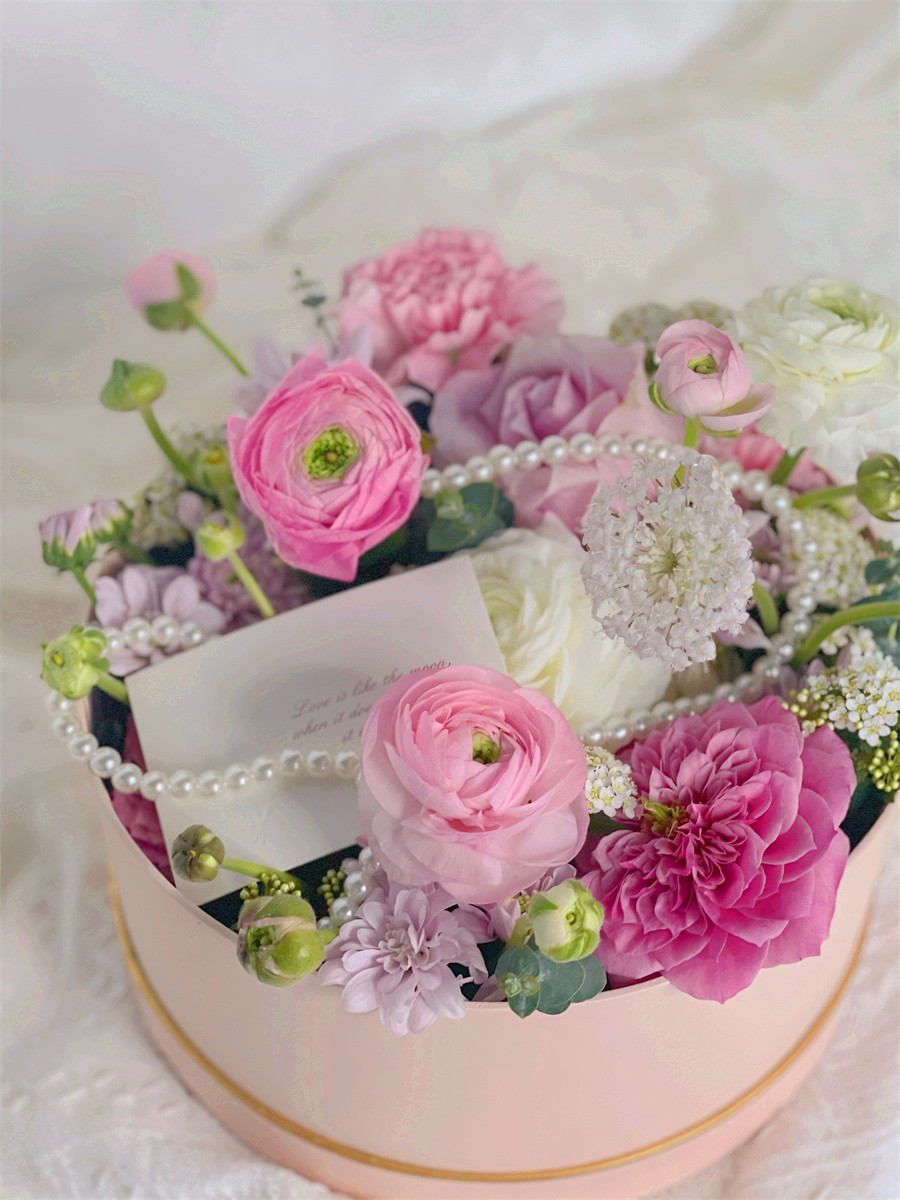 在制作韓式花盒時(shí),花盒以及花材的色彩采用單色或同色系,即使選擇撞色的花材進(jìn)行搭配,也要適中保持干凈整潔。在進(jìn)行插花設(shè)計(jì)時(shí),遵守風(fēng)格自然,精致浪漫,配色清新,不局限于單一品種……這樣打造出來的花盒總能散發(fā)出一絲感性與溫暖的色彩。