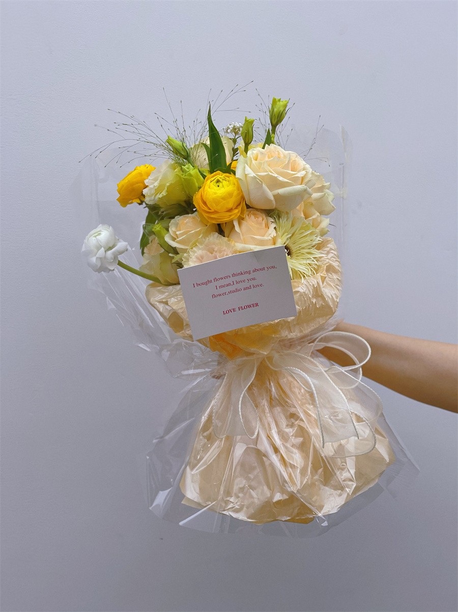在進(jìn)行圓形花束的制作時(shí),在確定主花后,便可以按照螺旋的方式一次添加花材,使得整束花看起來飽滿之后,稍作調(diào)整成為一個(gè)圓形的輪廓,然后便可以用繩子在根部綁好進(jìn)行修剪?;ú奶幚砗昧酥?,將包裝紙裁剪出適當(dāng)?shù)拇笮。缓蟾鶕?jù)花的形狀包裹起來,用彩帶幫緊并打成一個(gè)蝴蝶結(jié),這樣圓形小花束就完成了。