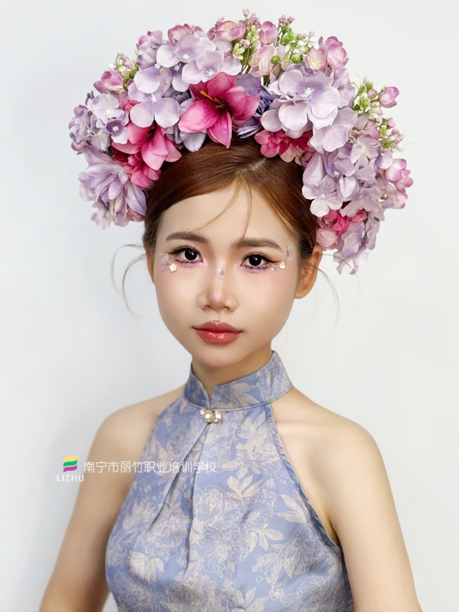 簪花造型課堂實(shí)況,廣西美妝課堂作品欣賞