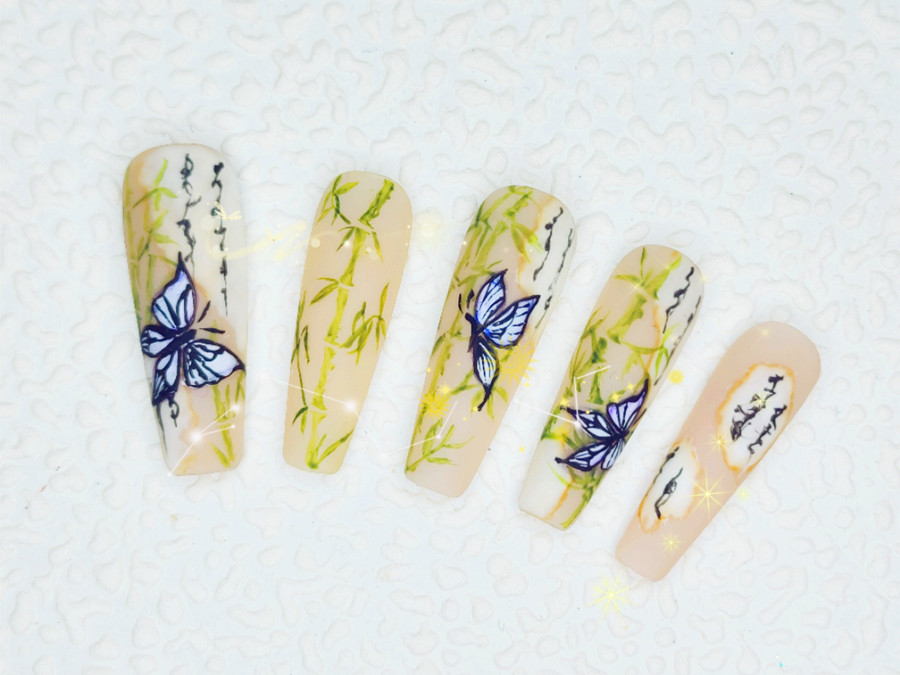 麗竹學(xué)校美甲專業(yè)的同學(xué)們?cè)诒敬萎厴I(yè)作品中,就將竹子和蝴蝶以及韻味十足的書(shū)法相互結(jié)合,運(yùn)用彩繪的方式描繪出了一幅新中式美甲。下面就趕緊和我們一起去看看吧!