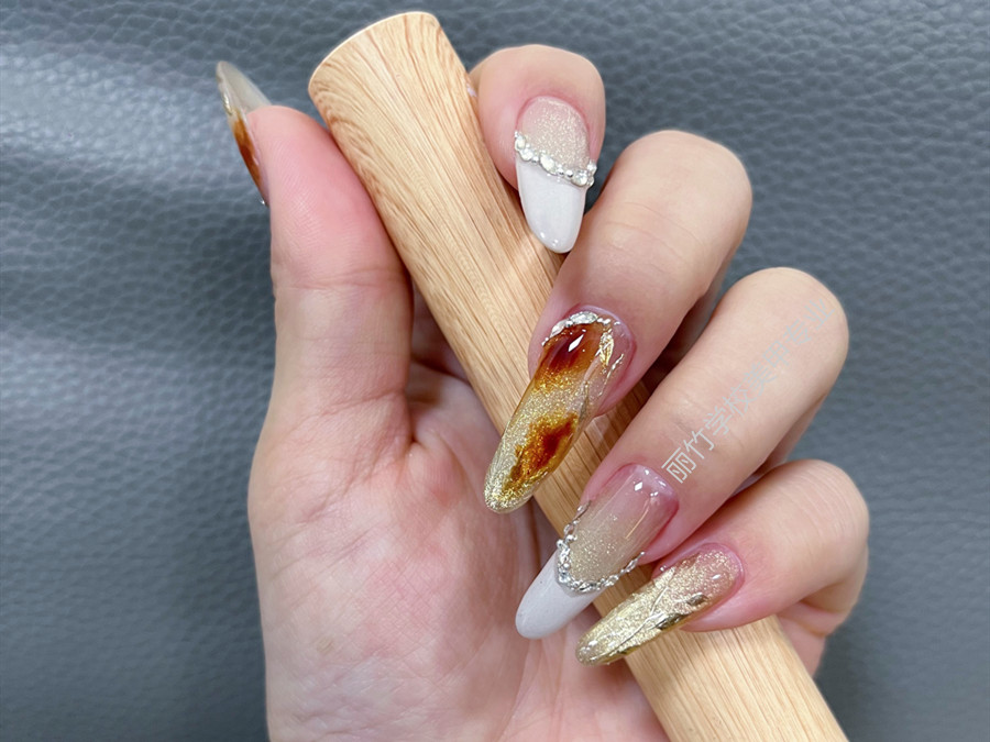廣西美甲訓(xùn)練、廣西美甲職業(yè)教育:作品主要以貓眼膠作為主題繪制。以棕色暈染起到點(diǎn)睛之筆的作用,然后在指尖勾畫出法式風(fēng)格的微笑弧線,然后用白色彩繪膠進(jìn)行填充,之后在粘貼碎鉆進(jìn)行裝飾,使得整副美甲作品變得更加高雅和精致。