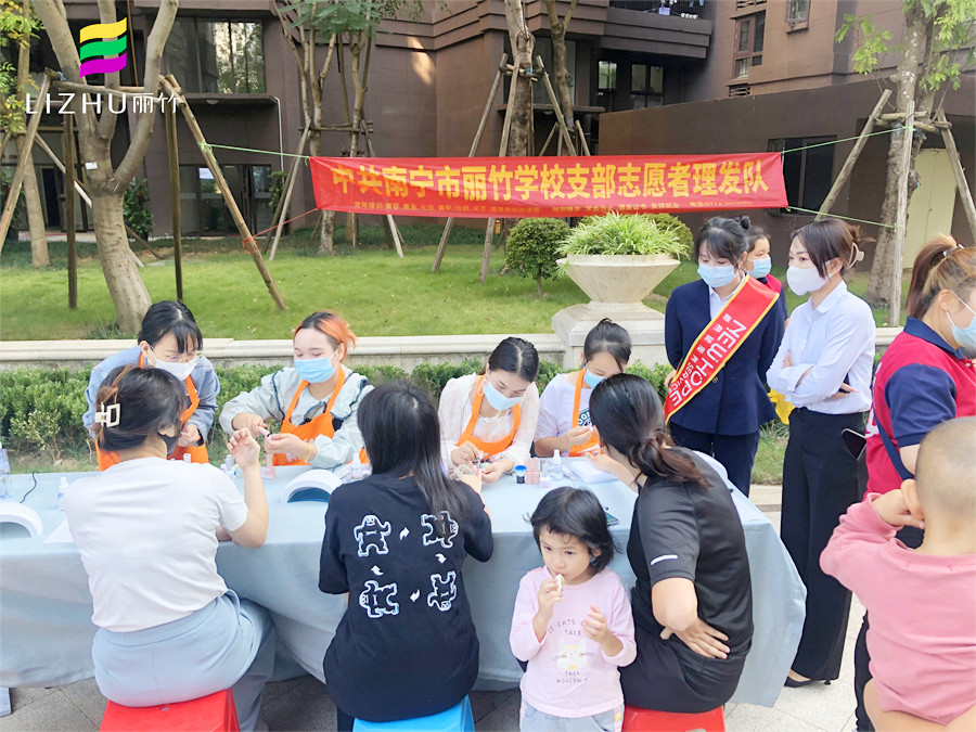 美甲外出實(shí)操、南寧美甲公益活動(dòng)分享:10中旬的南寧,早上已經(jīng)感到很明顯的涼意,但在新希望社區(qū)的花園廣場(chǎng)上,卻熱火朝天,人聲鼎沸,仿佛入秋的涼意從未在這里停留。而在這里,南寧美甲學(xué)校-麗竹學(xué)校美甲專業(yè)在黨支部的帶領(lǐng)下,正在為居民們進(jìn)行美甲公益活動(dòng)。