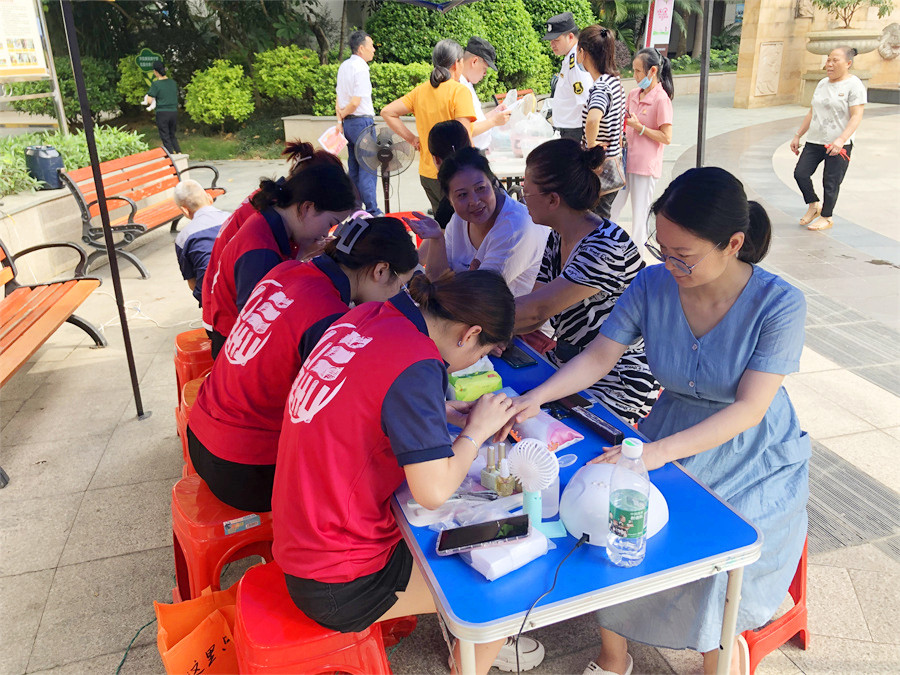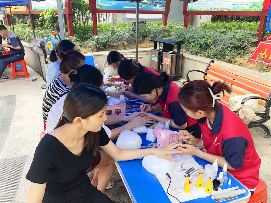 雖然有帳篷作為乘涼物遮擋,但不斷從地面向上生氣的熱氣,以及沒有任何一絲微風(fēng)吹過,還是讓廣西美甲培訓(xùn)班的學(xué)員們汗流浹背。但看著越來(lái)越多的居民蜂擁而至,學(xué)員們來(lái)不及擦拭額頭上的汗珠,依舊細(xì)心地詢問每一位居民的需求,然后便又快又專業(yè)的開始操作。