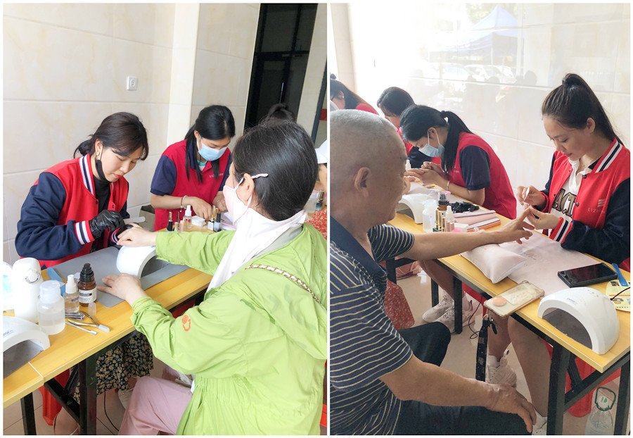 活動現(xiàn)場,雖然來的都是叔叔阿姨,爺爺奶奶,但愛美之心人皆有之。同學們每操作一個步驟,都會很耐心地為大家進行解釋。即使現(xiàn)場條件有限,但同學們還是認真地為大家修剪死皮,打磨甲形,拋光甲面,涂抹單色等項目。而居民也用手機記錄下了這次難得的美甲體驗,現(xiàn)場氣氛十分熱烈。