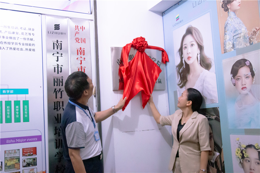 參加本次簽約揭牌儀式的嘉賓有:南寧麗竹職業(yè)培訓(xùn)學(xué)校黨支部書記,校長王良友、南寧職業(yè)技術(shù)學(xué)院---共贏教學(xué)點校長徐穆英、南寧麗竹職業(yè)培訓(xùn)學(xué)校副校長歐榮蘭、南寧麗竹職業(yè)培訓(xùn)學(xué)校招生就業(yè)部主任潘偉平、南寧麗竹職業(yè)培訓(xùn)學(xué)校教學(xué)部主任劉治才、南寧職業(yè)技術(shù)學(xué)院---市場招生辦教務(wù)監(jiān)督主任李容、南寧麗竹職業(yè)培訓(xùn)學(xué)校化妝總監(jiān)玉可寧、南寧麗竹職業(yè)培訓(xùn)學(xué)校美發(fā)組組長王姚芳、南寧麗竹職業(yè)培訓(xùn)學(xué)校美容組組長韋紅蘭以及麗竹學(xué)校美容,美發(fā),美甲,化妝組老師。