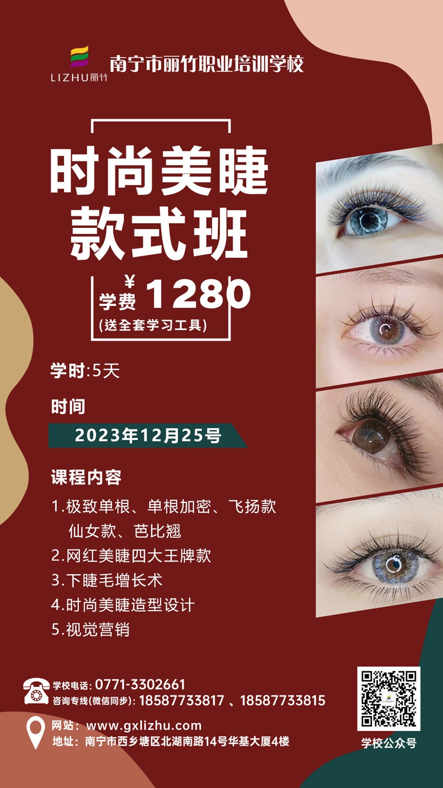 南寧美睫師、零基礎(chǔ)美睫教學(xué):如果你想在南寧學(xué)美睫,想知道南寧美睫培訓(xùn)班哪家好?那么千萬不要錯過南寧美睫學(xué)校(麗竹美睫學(xué)校)12月25日開班的時尚美睫款式班啦!如果你真的想學(xué)一門技術(shù),千萬不要粗過了,因為麗竹學(xué)校2024年學(xué)費將全面恢復(fù)原價啦!