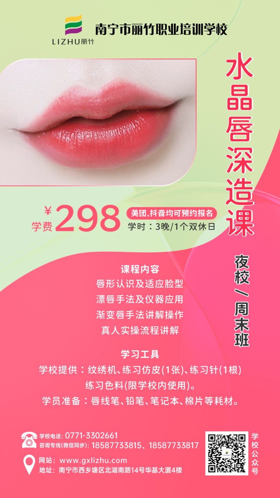 南寧美業(yè)技術培訓學校-麗竹學校特色課程推薦---夜班/周末班,來咯!南寧化妝培訓學校(個人形象化妝班)、南寧美甲培訓學校(個人美甲定制班)、南寧美容護膚培訓學校(家庭護膚定制班)、南寧紋繡培訓(水晶唇深造課)、南寧眉眼唇培訓學校(眉眼定制課)。