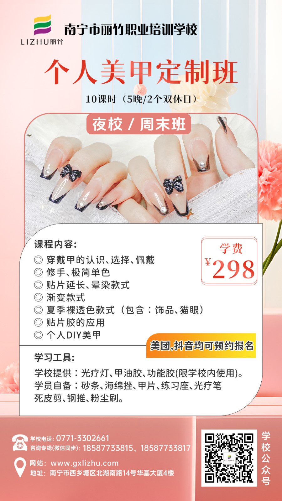 南寧美業(yè)技術培訓學校-麗竹學校特色課程推薦---夜班/周末班,來咯![慶祝][太陽]無論你是上班族,寶媽,自由從業(yè)者……無論你想周末上課,還是上晚課,統(tǒng)統(tǒng)都由你說了算??!